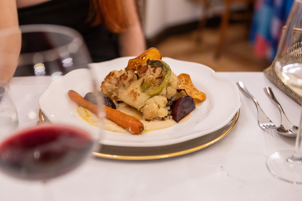 Glavno jelo ribeye odrezak poslužen na pireu od celera, povrćem na maslacu u demi glace umaku, dok je veganski slijed uključivao steak od cvjetače s karameliziranom mrkvom i čipsom od batata.