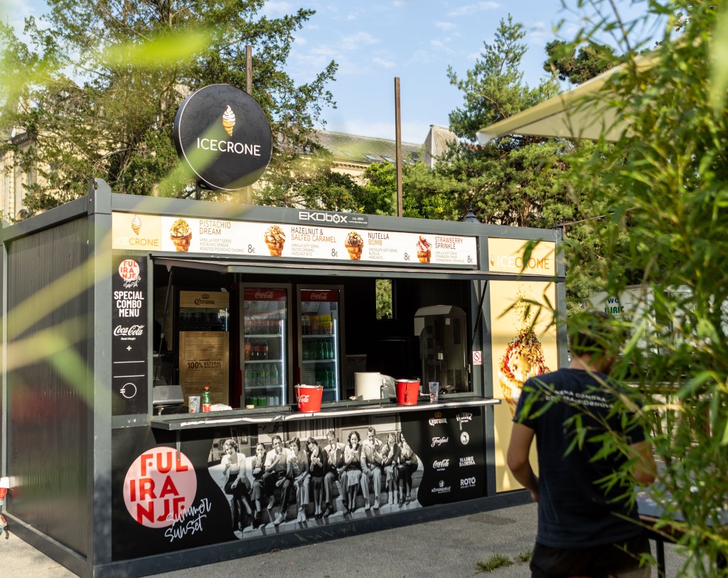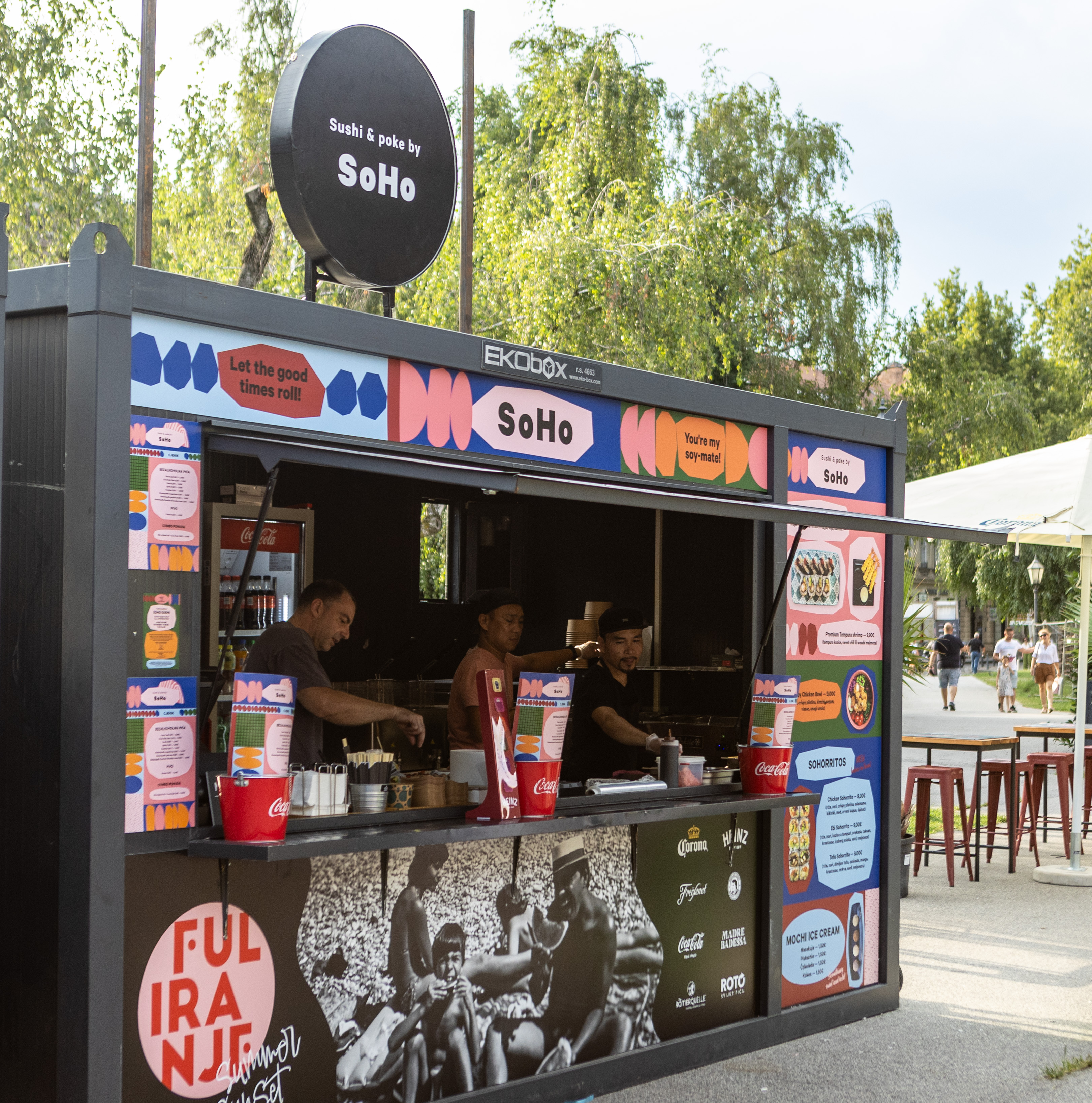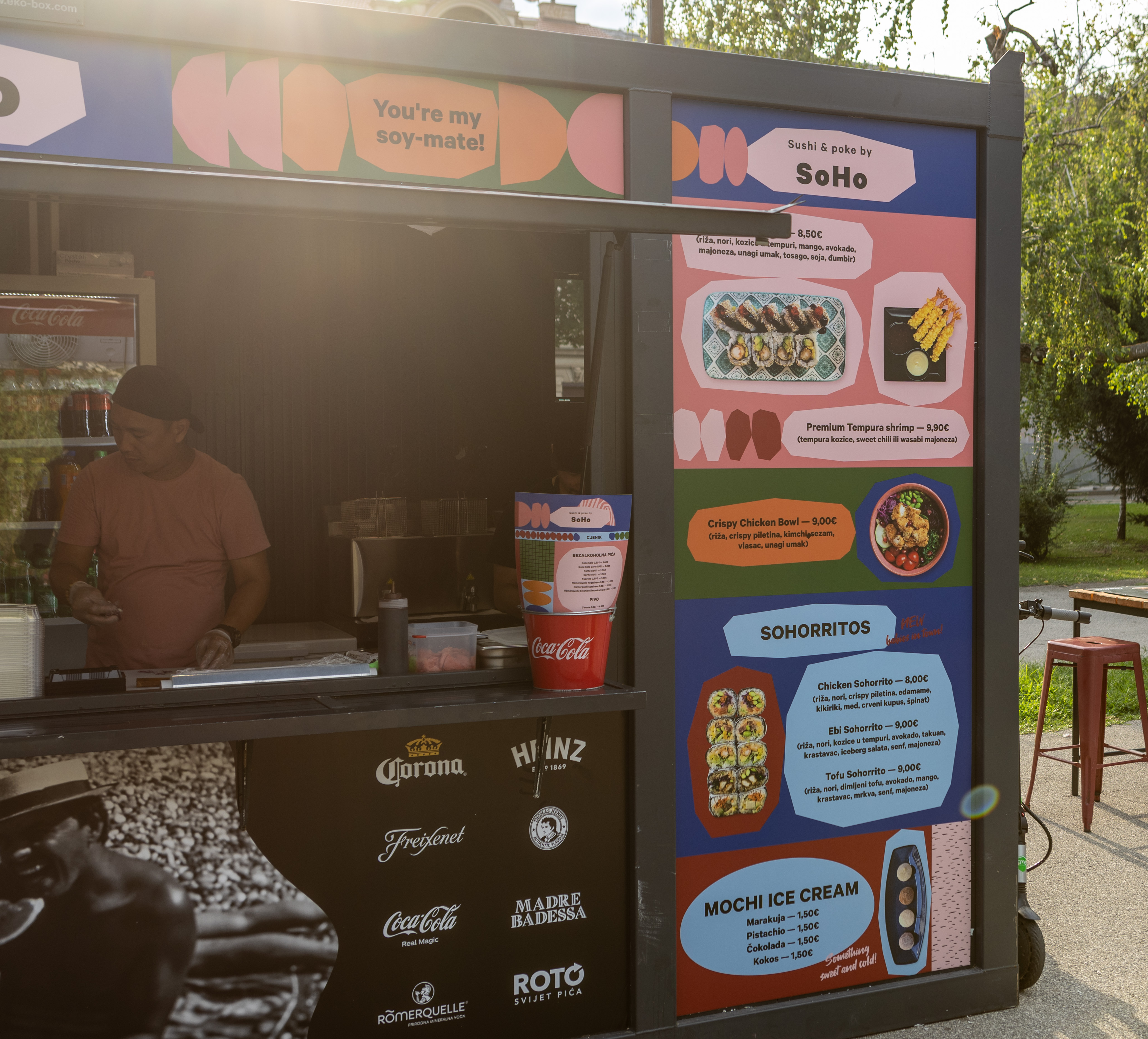 Na kućici Sushi & poke by SoHo isprobali smo sushi koji je napravljen s kozicama u tempuri, mangom, avokadom i unagi umakom. Svi okusi su lijepo izbalansirani. Cijena je 8.50 eura. U ponudi se nalaze i sohorritosi što je novost na spomenutoj kućici. Dolaze u kombinaciji s crispy piletinom, kozicama u tempuri ili dimljenim tofuom. Cijena je 8 ili 9 eura ovisno o vrsti. Za zasladiti se tu su i četiri okusa mochi sladoleda – kokos, čokolada, marakuja i pistachio. CIjena jednog je 1.50 euro.
