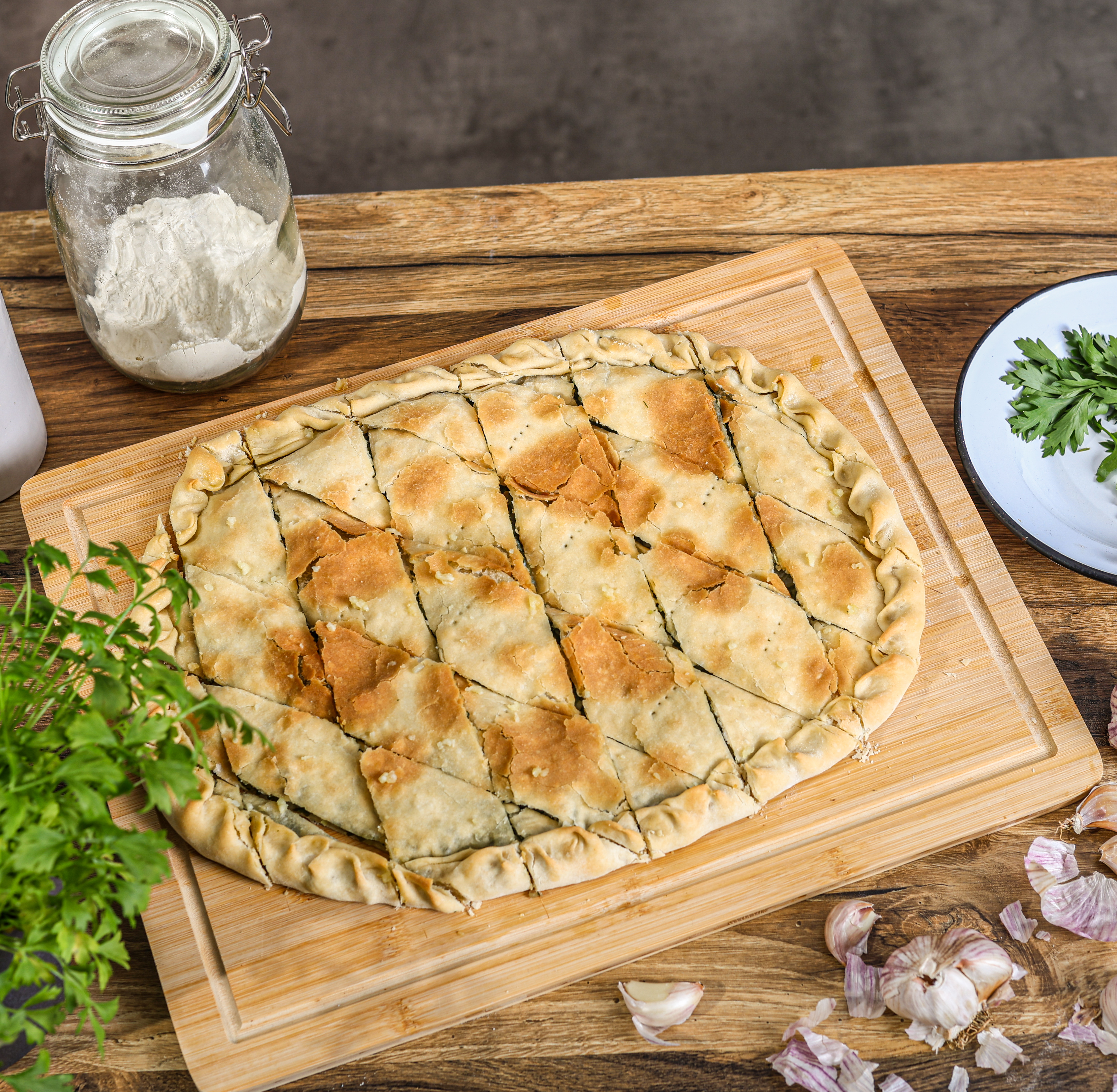 Sve pokrij s drugim komadom tijesta i spoji rubove oba tijesta tako da ga zamotaš prema unutra ili prema van, kako ti je god jednostavnije. Peci u zagrijanoj pećnici 20 minuta na 200 stupnjeva Celzijusa. Izreži soparnik u obliku malih rombova te ga premaži smjesom maslinovog ulja i češnjaka.