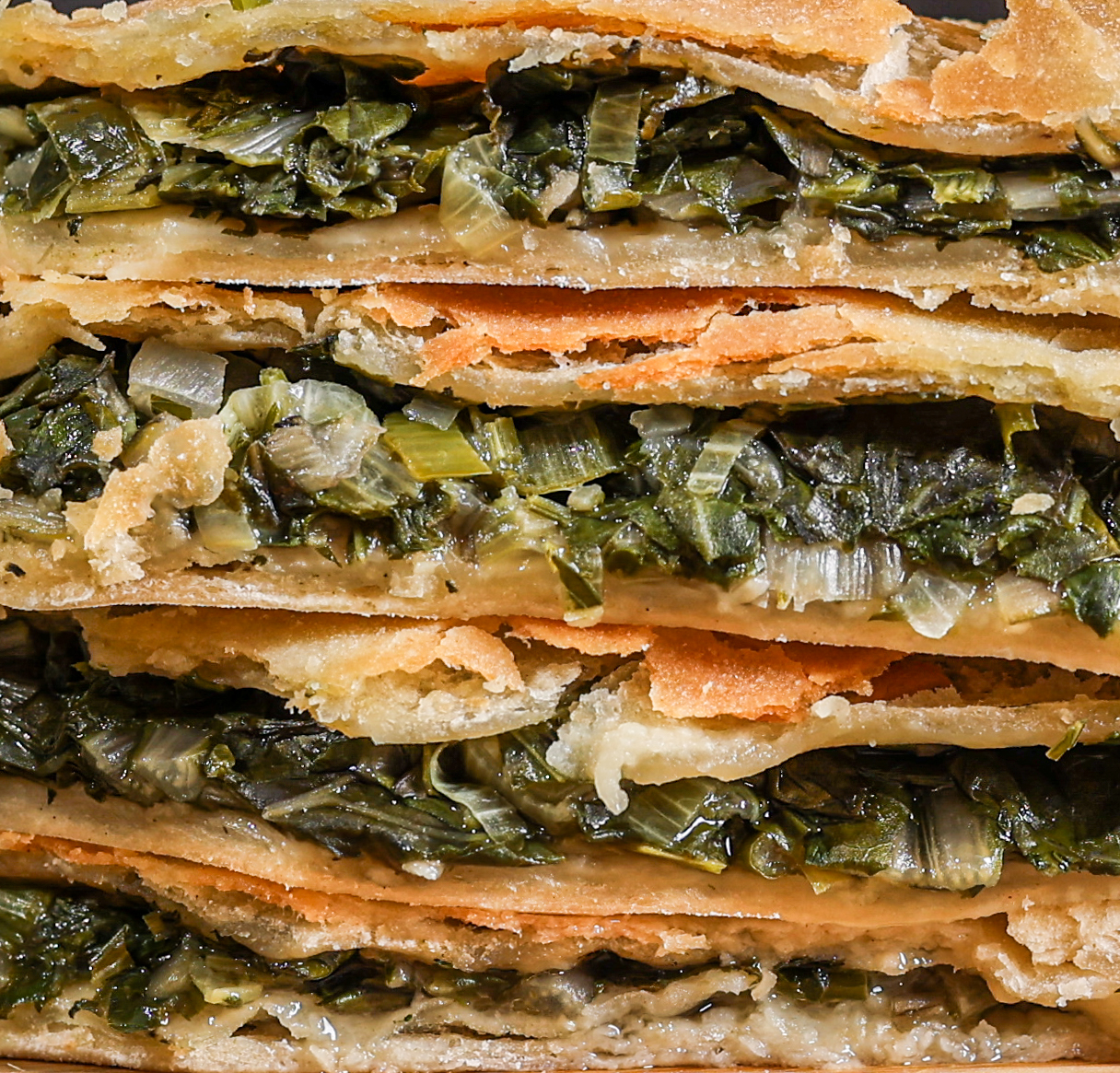 Posudu za pečenje blago pobrašni te stavi prvi dio tijesta. Prekrij tijesto s blitvom.